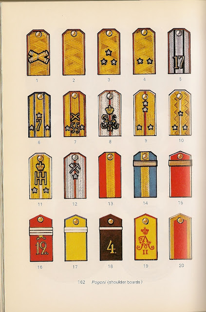 Nº 1.-Field Marshal.-Nº 2 .-General .-Nº3.-Lieut.-General.- Nº 4.-Mayor -General . Nº5.-Colonel.-,17 th Don Cossack Regiment.-.-Nº 6.-Lieut.-Colonel,7 th Regiment.-Nº7.-Mayor,55 thArtillery Brigade.-Nº8.-Captain Guard Cuirassiers.- Nº 9.-Staff-Captain,9 th Dragoon Regiment..-Nº 10 .-Lieutenant ,3 th Husar Regiment.- Nº.-11.-2 nd Lieutenant,9 th Grenadiers Sibirski Regiment . Nº.-12.-Ensign, Army Sapper Batalíon..- Nº 13.-Warran Officer, Army Infantry(1st Brigade).-Nº14.-Sergeant- Mayor Army Infantry (2 nd Brigade).-Nº15 .-Sergeant-Mayor, Life Guards Horse Regiment