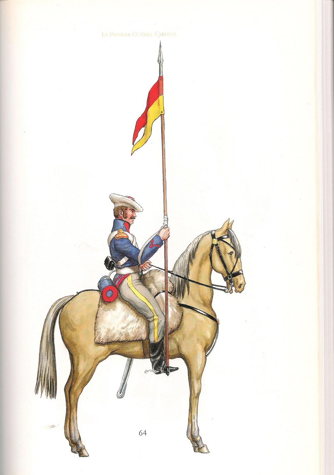 Hay varios marinos e infantes de marina que son isabelinos. Y todas las enseñas con cruz de Borgoña también. ¿Un Regimiento de la Constitución en el bando carlista? Pues claro que no. Pese al mito moderno, la cruz de Borgoña no fue un emblema carlista hasta 1935, pasado un siglo de esta guerra de 1833-1840. Bonitas ilustraciones.
