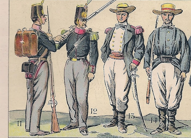 Nº 11.- Fusilero de linea.- (1848).- nº 12.-Cazador de linea(1848).- nº13.- Oficial ,1º compañia de Fernando Poo(1859). -nº 14.- Soldado de la 1ª compañia de Fernando Poo..